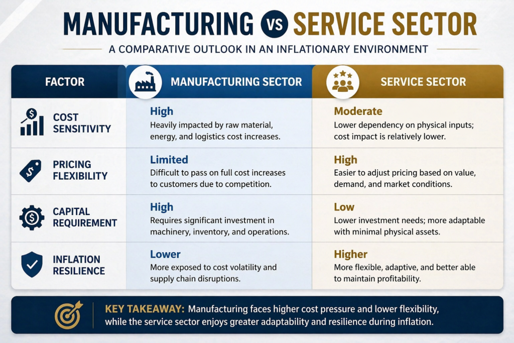 Inflation’s impact on businesses differs, especially between manufacturing and services. It affects production costs, cash flow, and investment. Businesses unaware of these effects face profitability and sustainability issues.